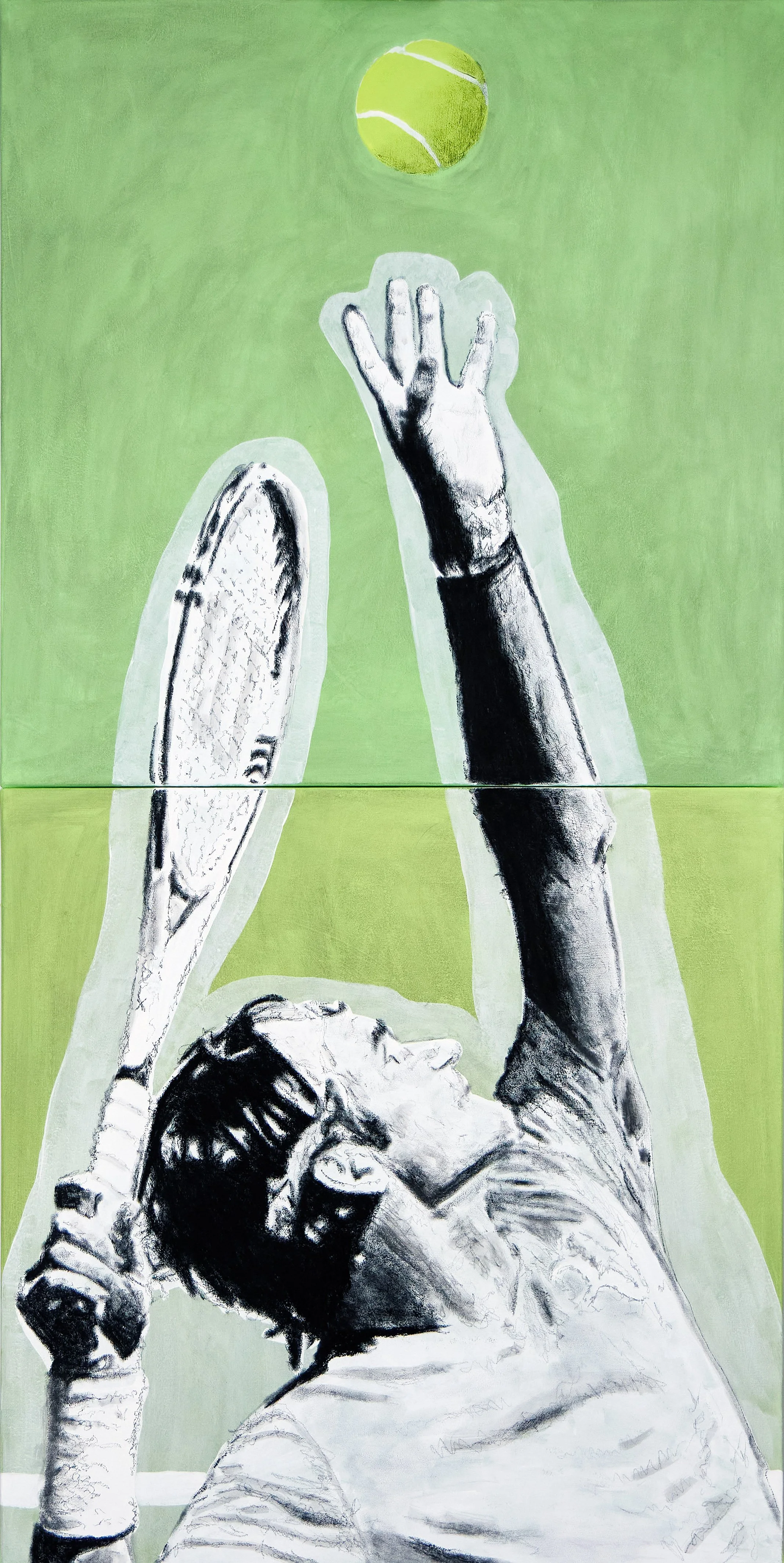 Here is a portrait of Roger Federer about to serve. This level of success in tennis take a life to achieve, it is your whole identity. Who is he with out it? In this study on the struggle of identity, this piece makes us ponder what happens when we are too old to be the version of ourselves we once were. What happens then?