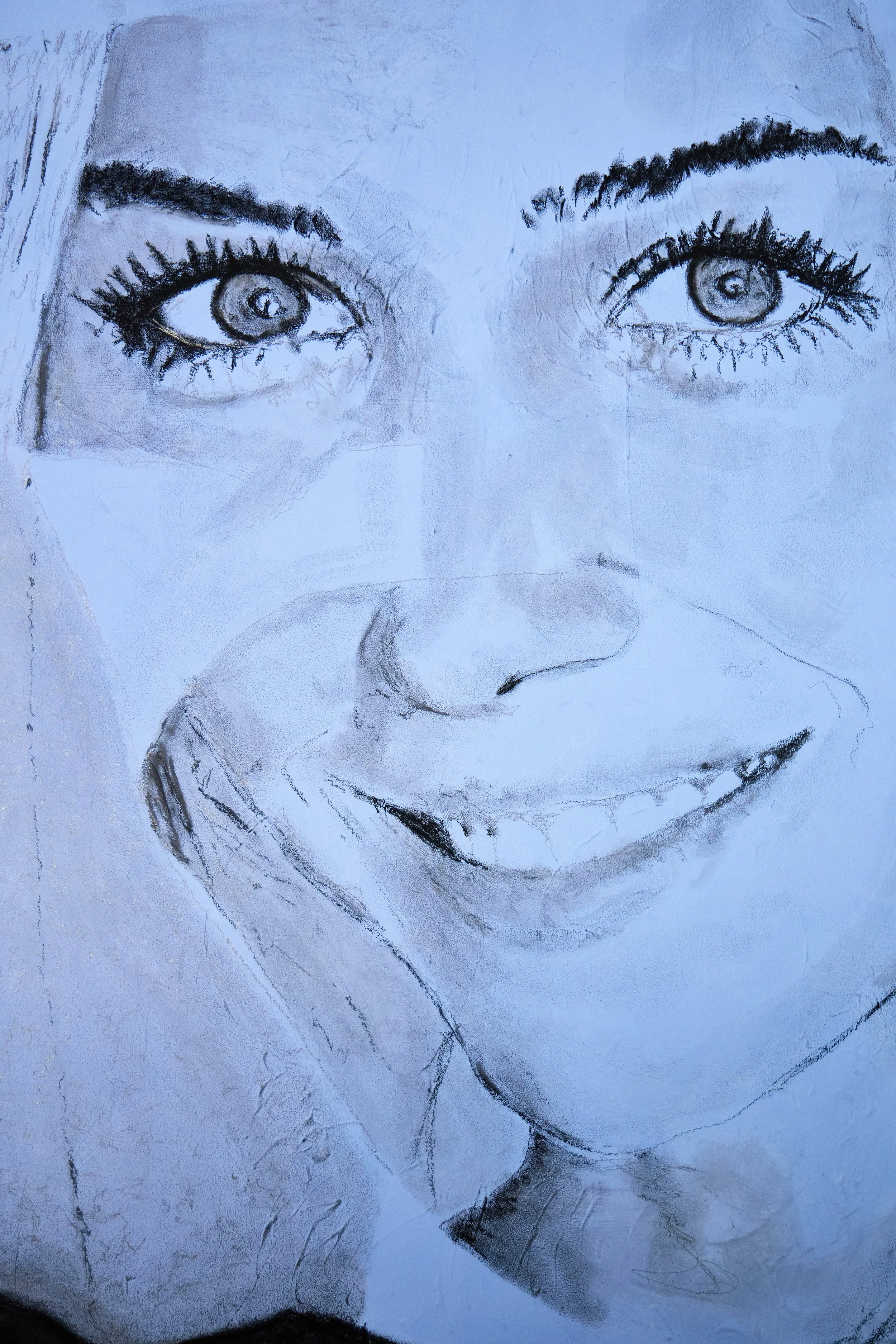 Part man, part woman, part abstraction. The piece is in blue representing sadness. She’s cute and young, looking at the viewer with energy and youthful beauty, yet the top of her head is that of a gentlemen which suggests she has a secret. Not fully able to be who she feels inside because of familial and social pressure she resorts to her traditional gender identity. The abstraction running through the middle of her face further suggest she’s wearing a mask.