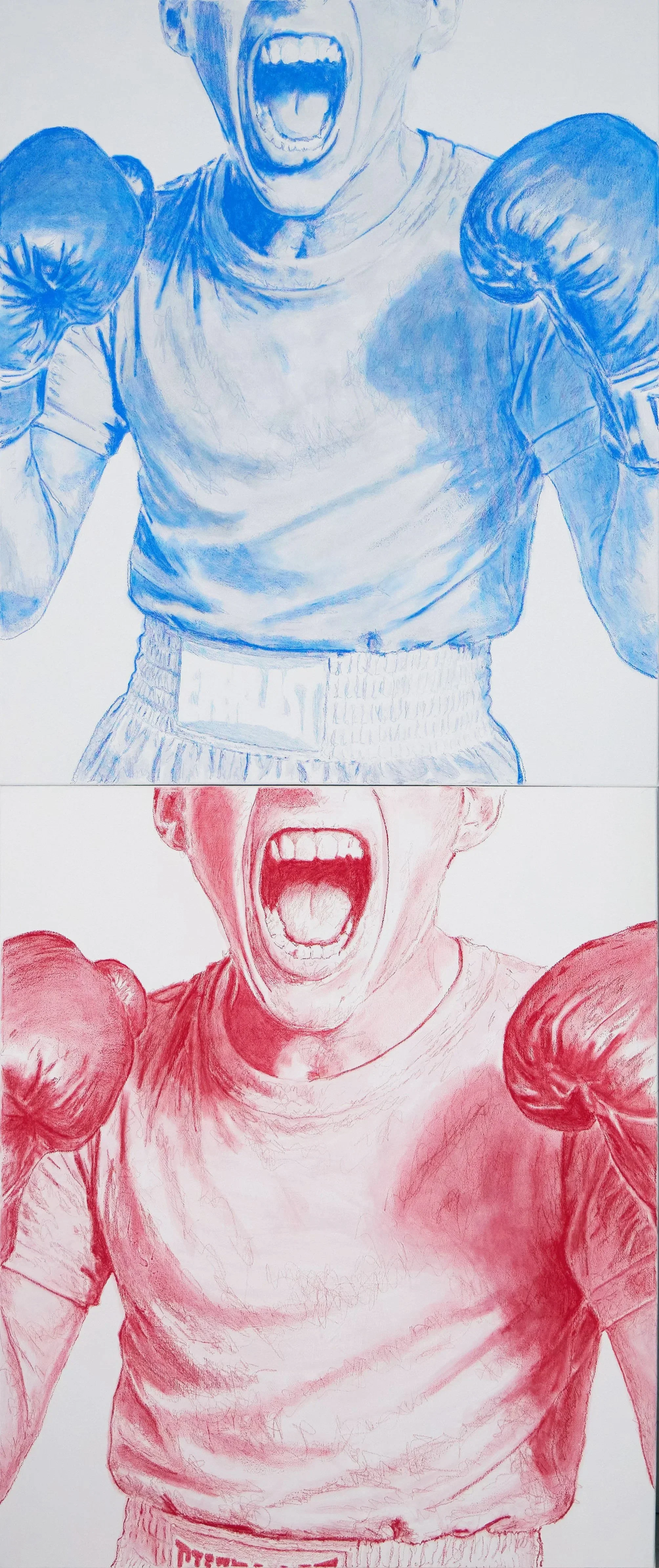 Our subjects look like they are either ready for a fight or have been fighting. The monochromatic makeup of each of the two pieces suggests the subject is fully consumed by their emotions, red, anger or rage, and blue, sadness. In context to the collection, ‘Becoming’ a look at the struggle of human identity, the subjects have fully identified with their emotions. When are we beings experiencing emotions, and when do we become identified with them? The t-shirts that they wear are not normal for boxing training or fighting, the t-shirts represent a bringing of everyday life into the fight.